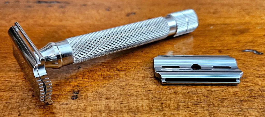 The RazoRock RECURVE uses standard double-edge blades—no gimmicks, no proprietary refills. At 10–15 cents per blade, each blade lasts 4–5 shaves.