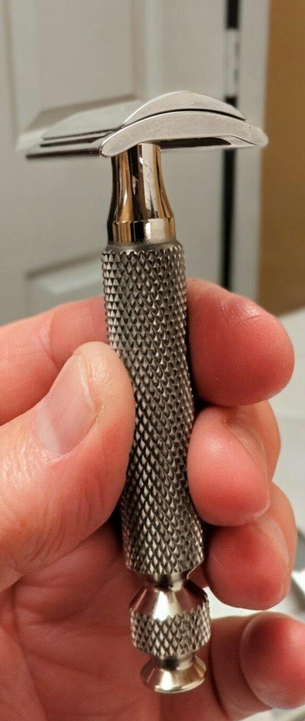 Finish: Please note, these razors are tools, not jewels. We use a vibratory tumbling finish process which maintains the highest possible tolerances for the razors. This means the razors will not be mirror finished and will not be mark-free. The razors may have some milling marks or finishing marks. The razors can always be jewelry polished by the client later but our goal is to sell the razor at the best possible tolerances and lowest possible price. The metal-on-metal contact from the handle locking against the base-plate will create a ring mark on the base. It's common for handles to have micro dents from the tumbled finish.