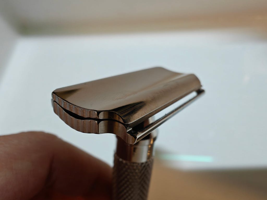 The RazoRock RECURVE uses standard double-edge blades—no gimmicks, no proprietary refills. At 10–15 cents per blade, each blade lasts 4–5 shaves.